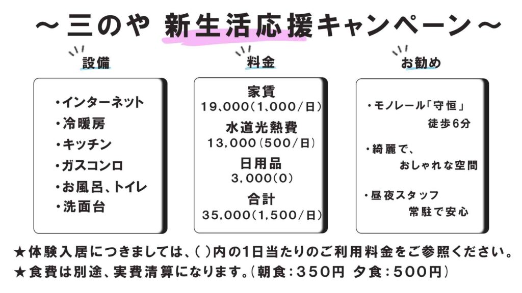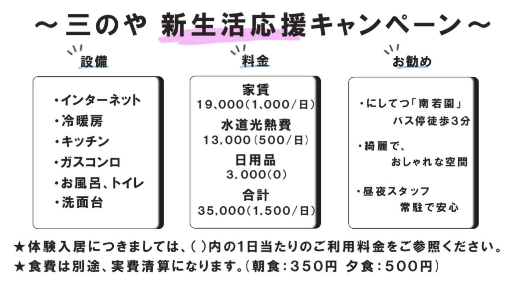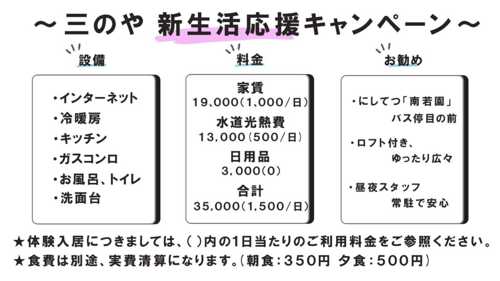 - 家賃(自己負担分)¥19,000(¥1,000/日)